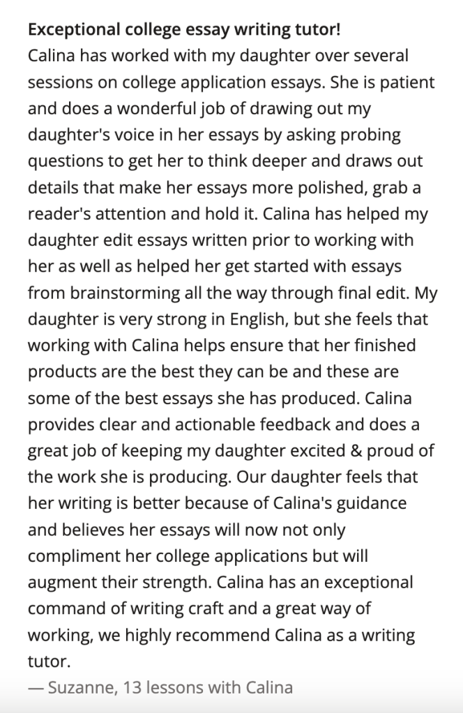 If you’re looking for support in crafting admissions essays, making progress on larger academic projects, or applying for competitive opportunities within the broader academic world, please contact me here or check out my profile Wyzant.